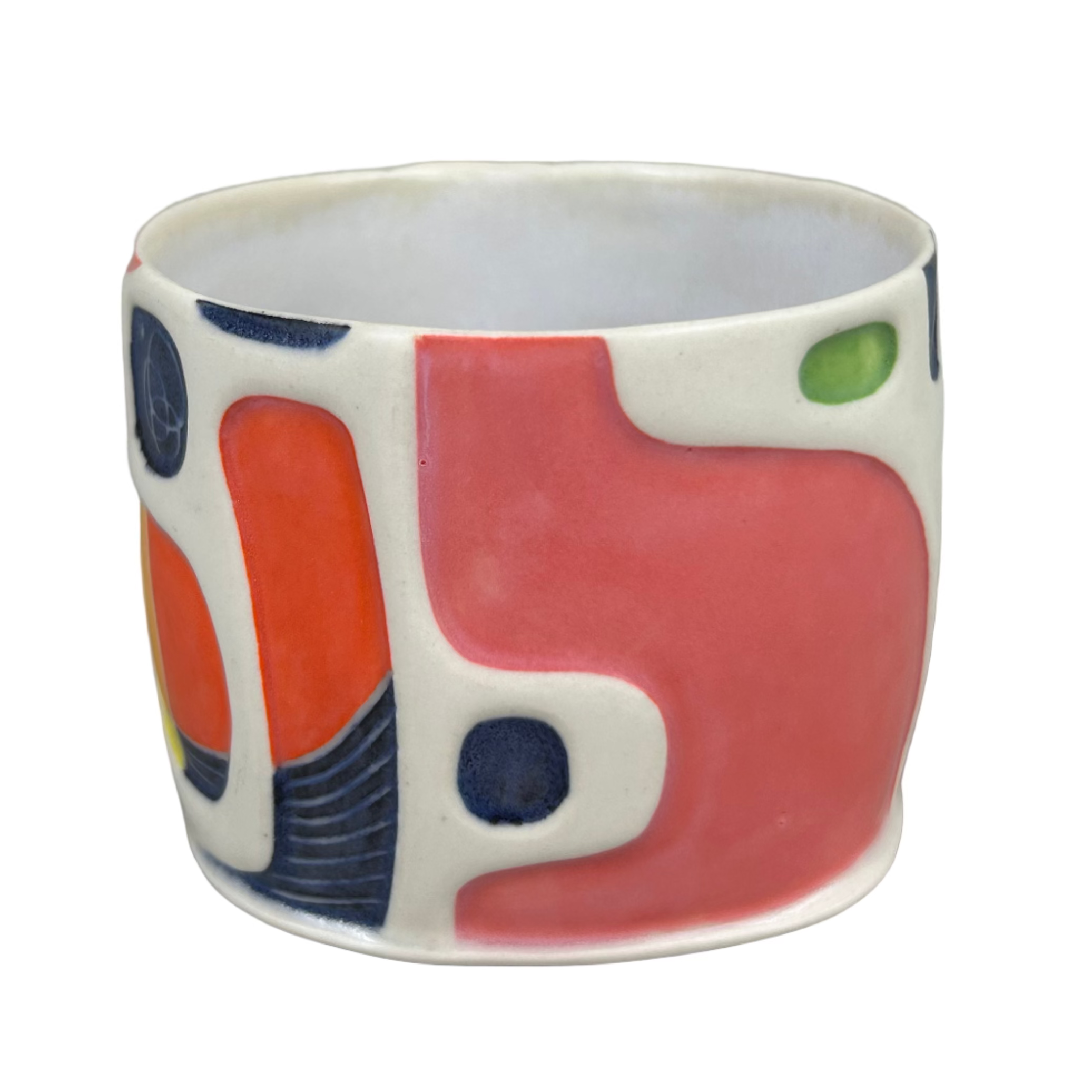"This unique handmade porcelain americano mug / cup is one of a kind. The embossed relief design heightens the tactile experience. Great for texture lovers! The high-footed, press-molded bottom lifts the cup off the table, and creates a slight ledge at the meeting of the cup walls. The outside surface is mindfully handpainted with underglazes in an abstract, graphic composition, detailed throughout with sgraffito carving. A combination of glossy and satin clear glaze completes the final outer finish.