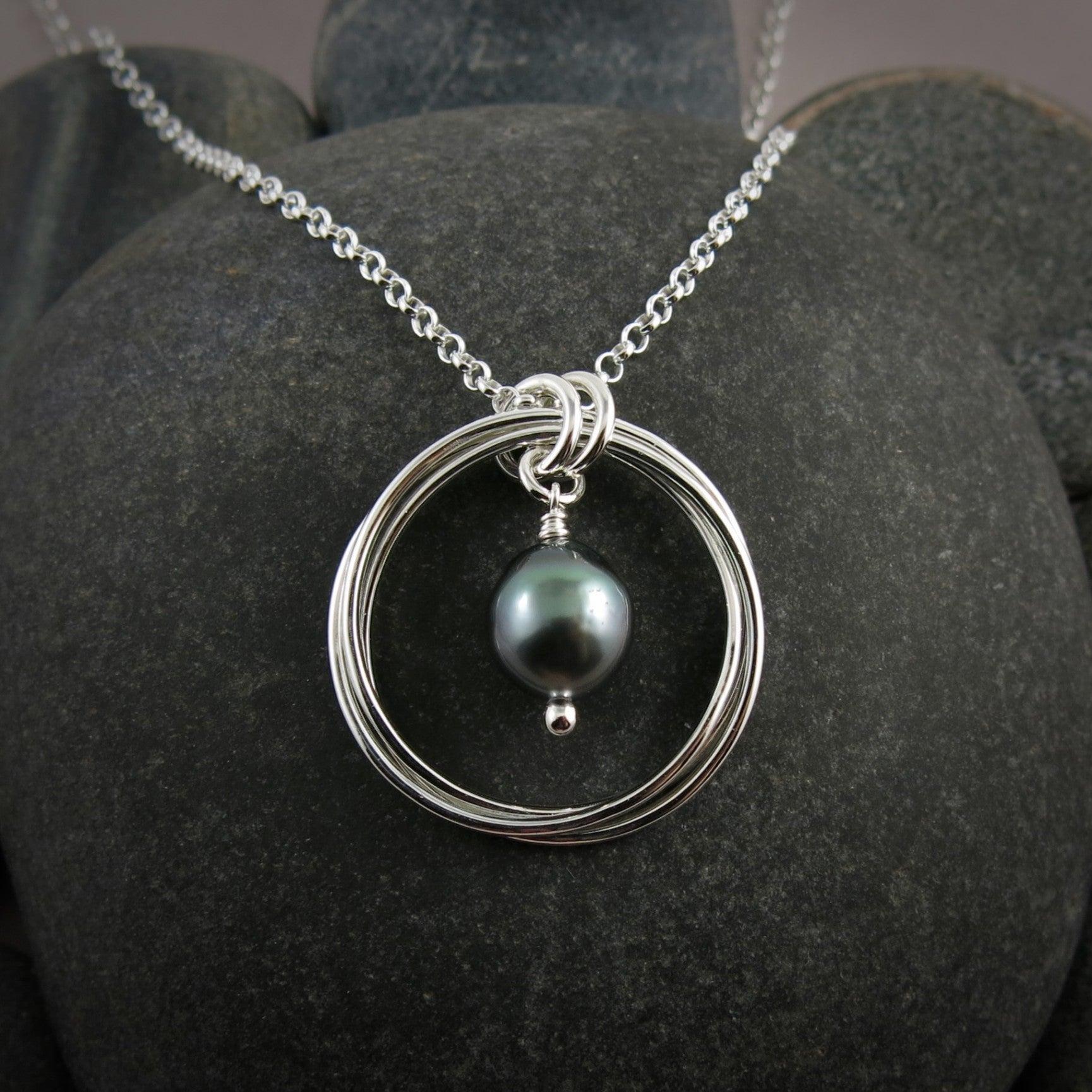 This sculptural necklace features a sterling silver knot formed from three interlocking rings—an elegant Möbius-inspired design symbolizing unity and flow. Suspended within the open knot is a dark Tahitian pearl with striking green overtones and subtle iridescence, offering beautiful contrast to the bright silver.
