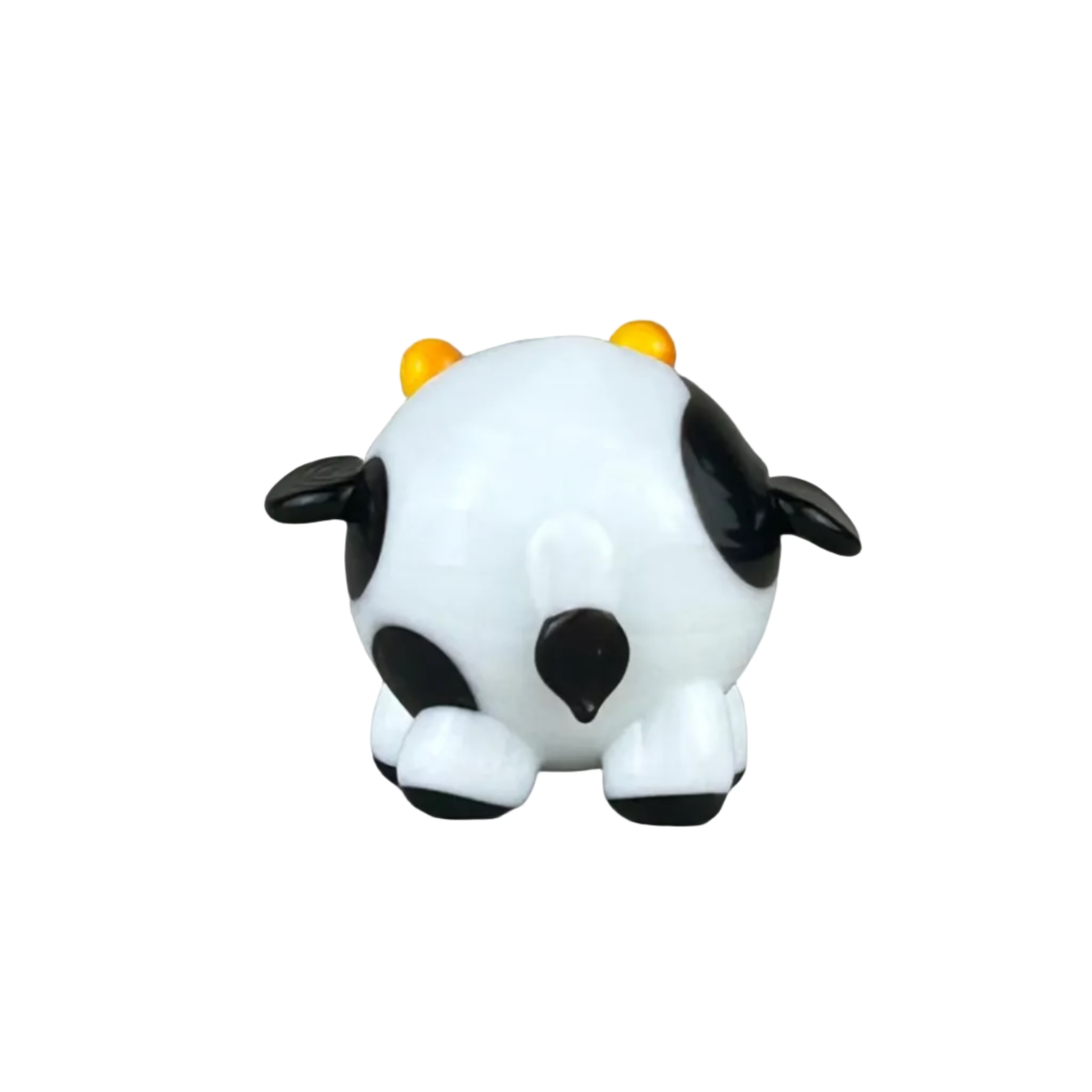 Sculpted in white with black spots, ears and hooves, tiny golden yellow horns, two tone tail and pink snout. With our signature blue anime-inspired eyes. Rotund and adorable!