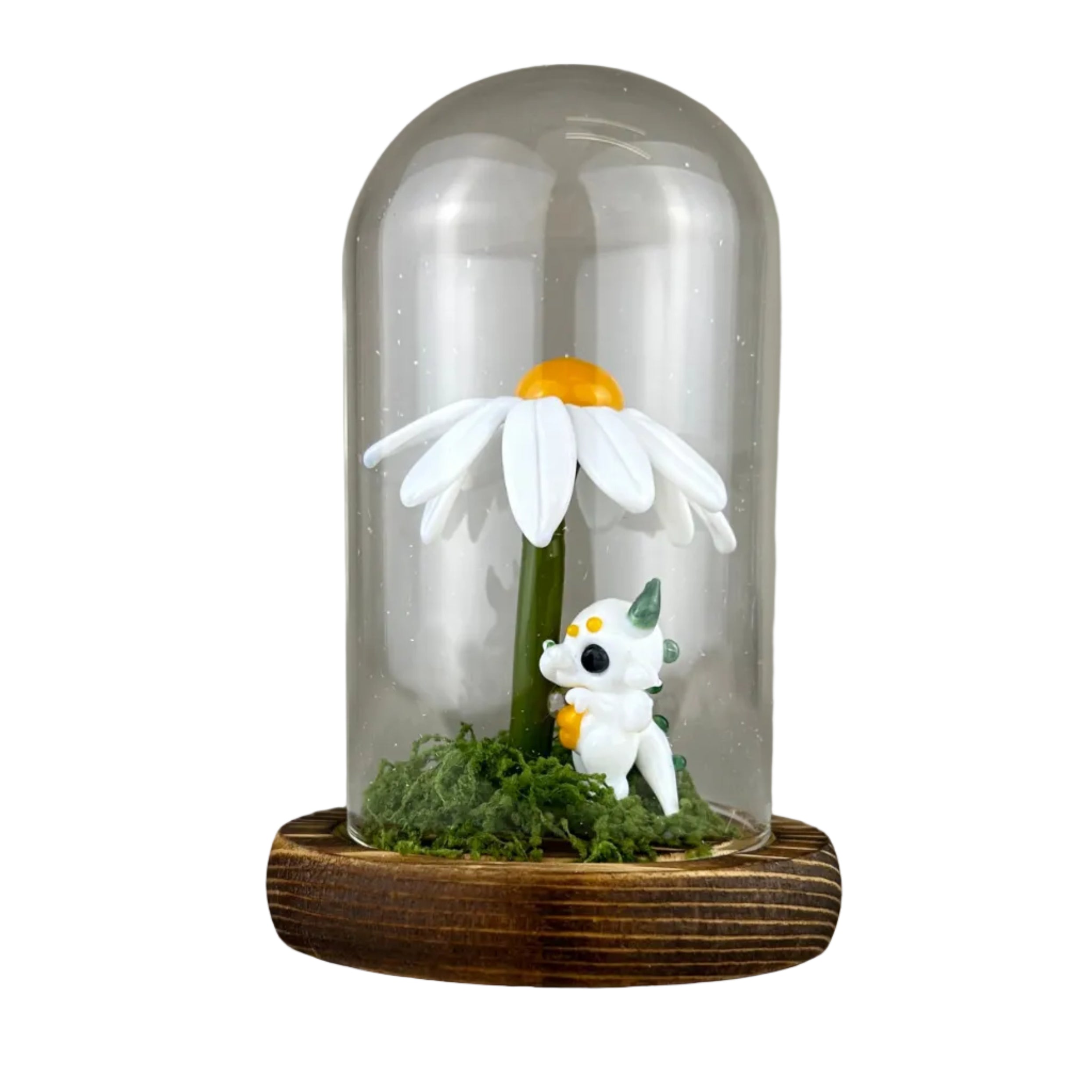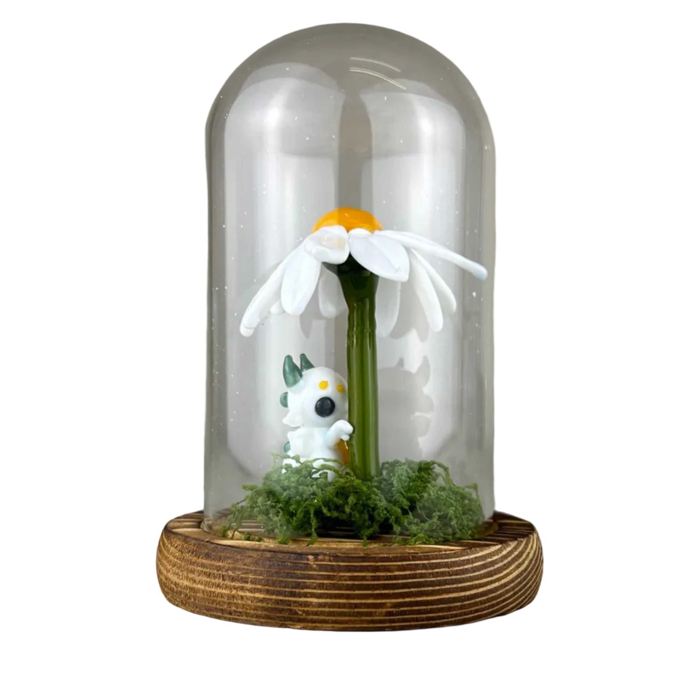 An enclosed vignette of a baby dragon hiding beneath a Shasta daisy.